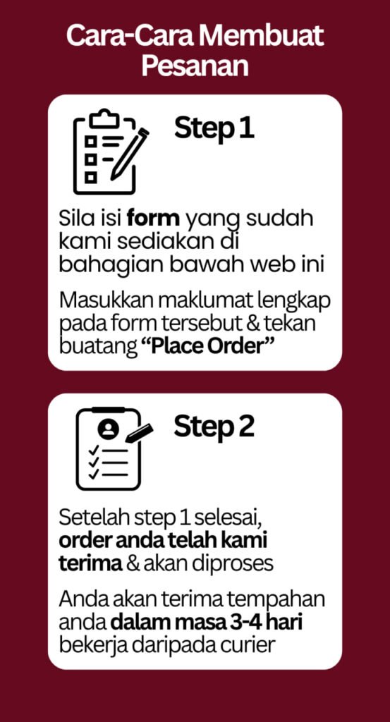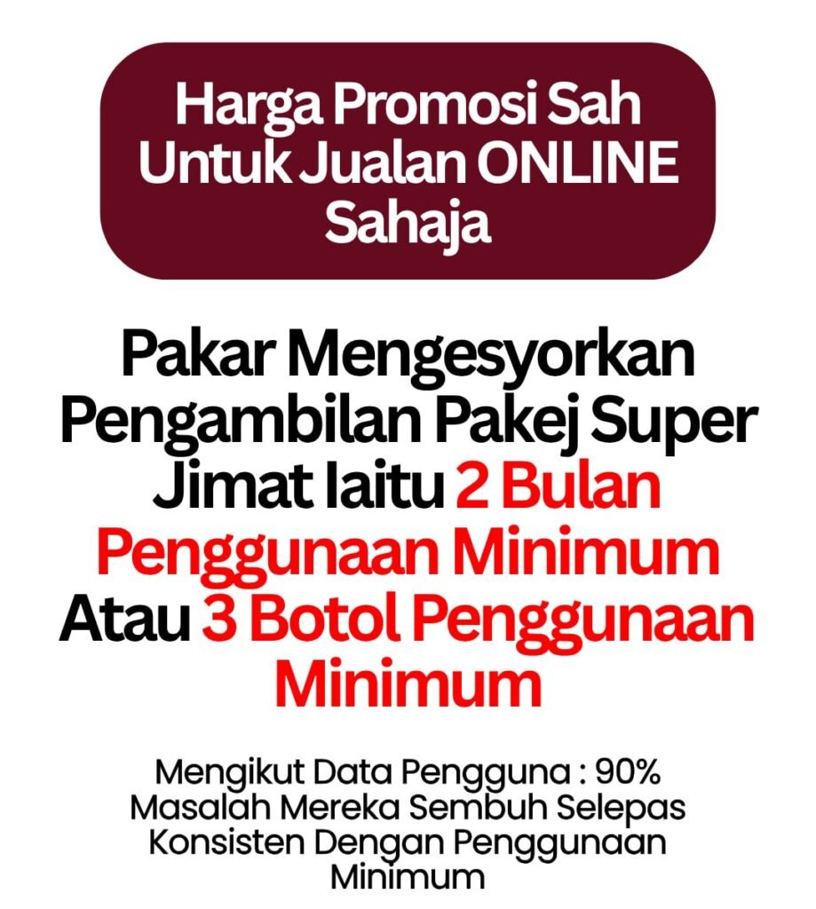 *PENAFIAN: Keberkesanan produk ini bergantung kepada kesesuaian individu. Setiap hasil dari penggunaan adalah berbeza bagi setiap individu. Produk ini akan memberi kesan terbaik sekiranya pengguna mengamalkan dengan cara betul berdasarkan banyak testimoni yang diperolehi. Kita berikhtiar, Tuhan yang menyembuhkan. Pengguna dinasihatkan menggunakan produk ini seperti arahan pada produk. Namun kami tidak bertanggungjawab jika sebarang masalah/komplikasi berlaku kepada pengguna di atas penggunaan produk ini.
